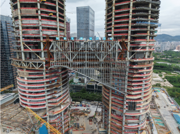 10月24日,深圳湾超级总部基地C塔(以下简称C塔)迎来重大进展,6000吨钢结构连廊在119.15米高空完成提升合龙。东、西双塔连为一体,如一对恋人优雅牵手,在深圳湾畔翩翩起舞。